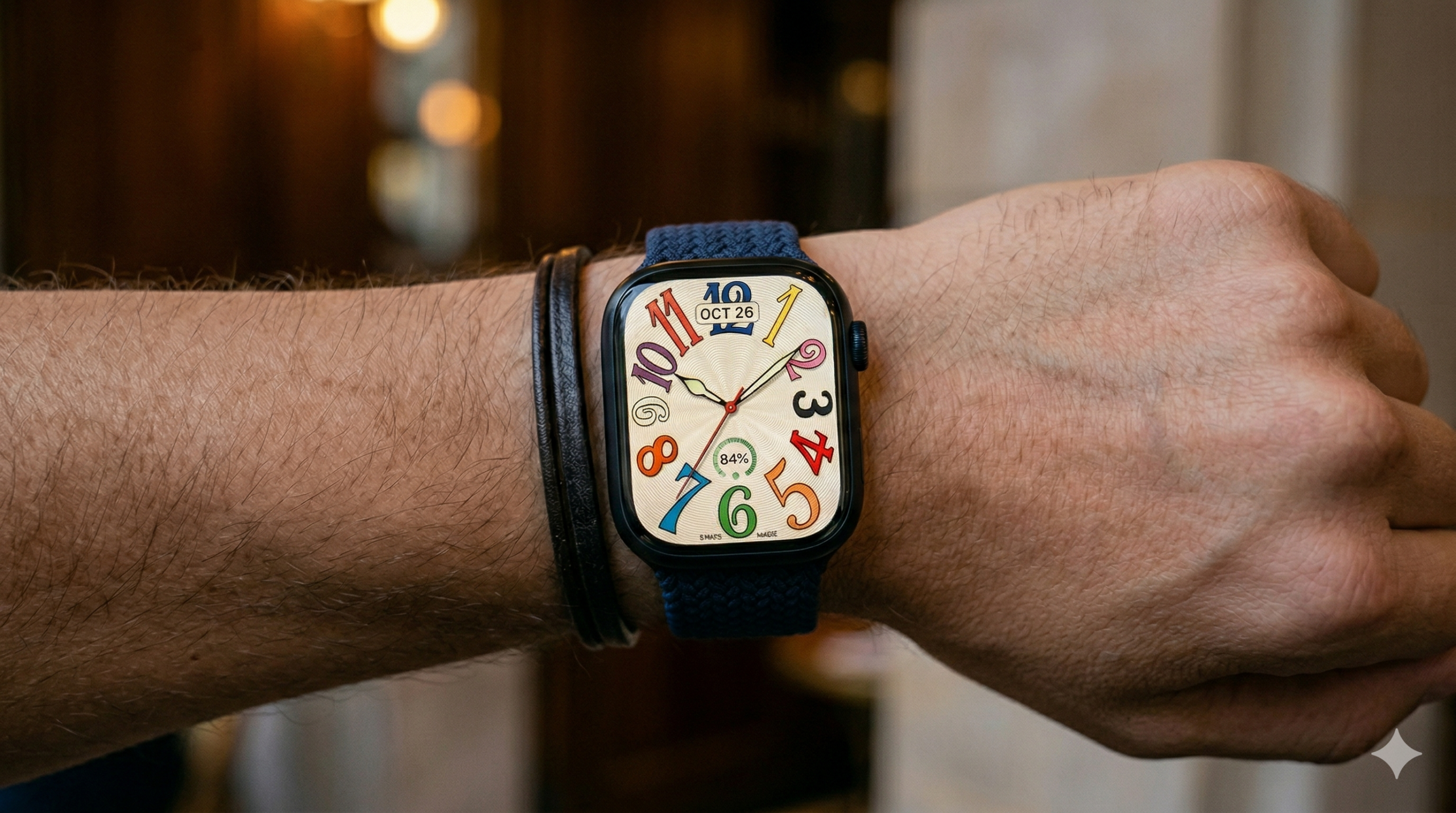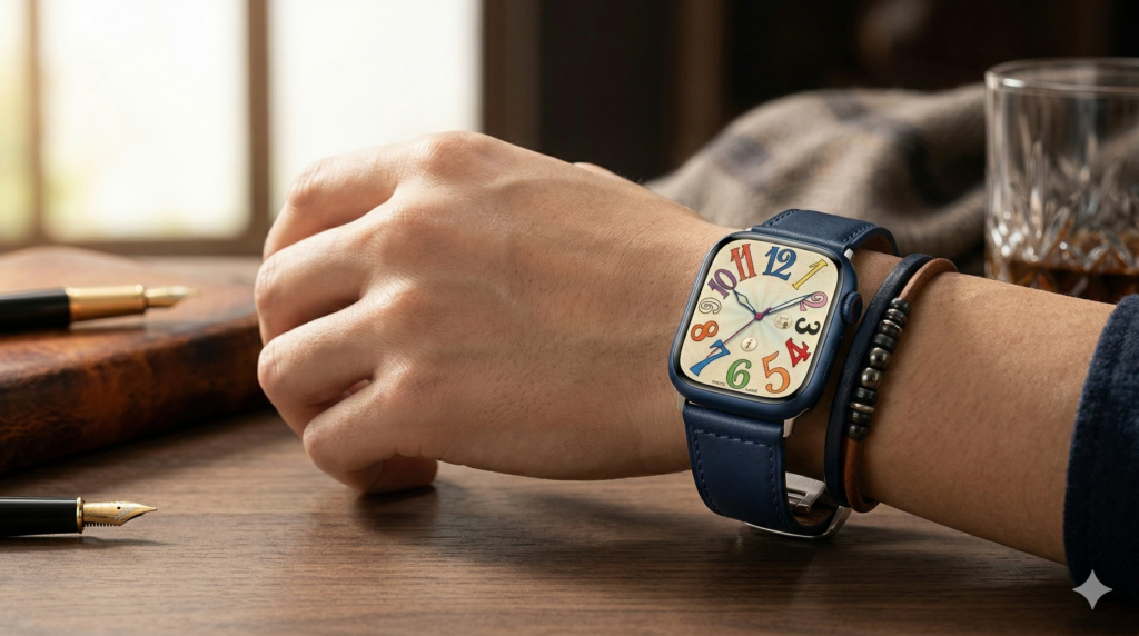 実は、このテーマで差がつくのは設定方法だけではありません。検索する人の多くは、「表示できるか」だけでなく、「どうすればもっとおしゃれに見えるのか」まで知りたいはずです。そこで意識したいのが、文字盤単体ではなく、Apple Watch全体の見え方です。たとえば高級時計らしい印象を強めたいなら、バンドの色や素材はかなり重要です。カジュアルなバンドより、落ち着いたレザー調や金属感のあるバンドの方が、クラシカルで上品な印象を作りやすくなります。
