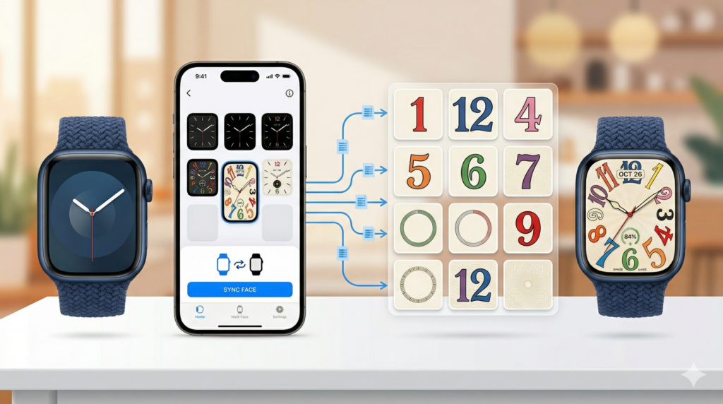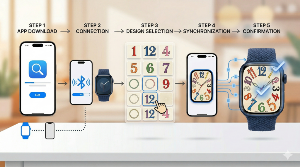 ここが、このキーワードで検索するユーザーにとって最も知りたい部分です。流れとしては、Apple WatchとiPhoneが正常に連携していることを確認し、文字盤カスタマイズ用アプリを導入し、その後デザインデータを読み込んでApple Watchに表示させる、という順番で考えるとわかりやすいです。Apple純正フェイスを直接書き換えるわけではないため、「設定したのに純正文字盤一覧に出てこない」と混乱しないよう、この違いを最初に説明しておくと親切です。